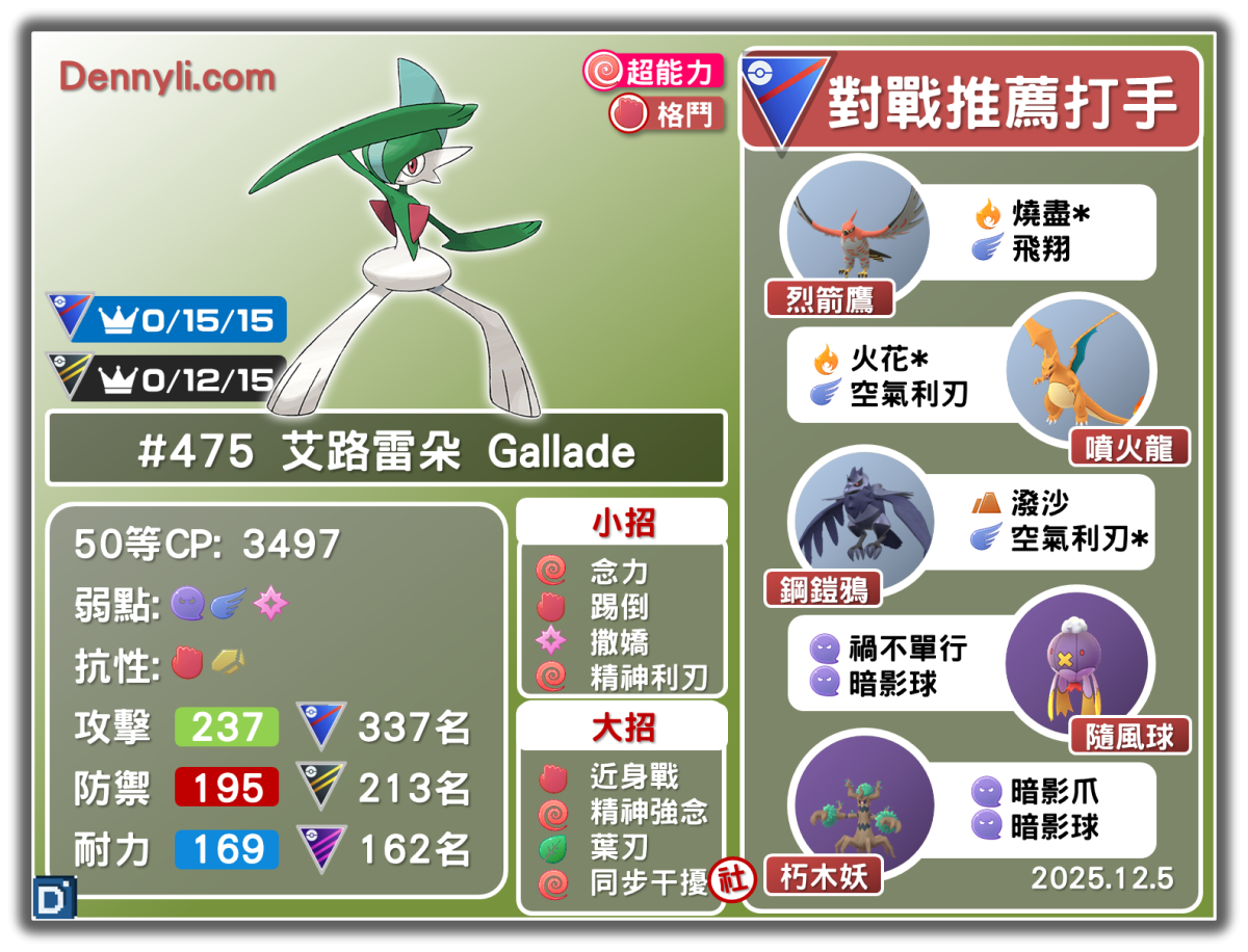 艾路雷朵在50等CP達到3497,在三圍數值的部分,攻擊力算優異而坦度偏弱,屬性抗性的表現也偏少,對戰時非常仰賴有盾來支撐持久力。在有精神利刃後能以最快速8T出擊,配合爆傷的近身戰給予對手極大的壓力,算是一隻逼盾很強的角色…(詳細資料)