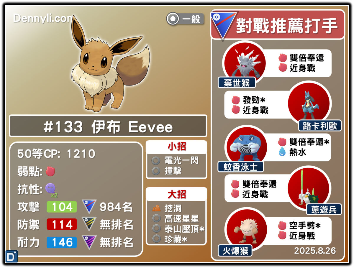 伊布雖然在卡通中常有出場戲份,但遊戲對戰是比實力的,伊布CP也才1210,在三個對戰聯盟的實力完全是無法打贏對手,因此伊布在對戰的定位為吉祥物等級…(詳細資料)