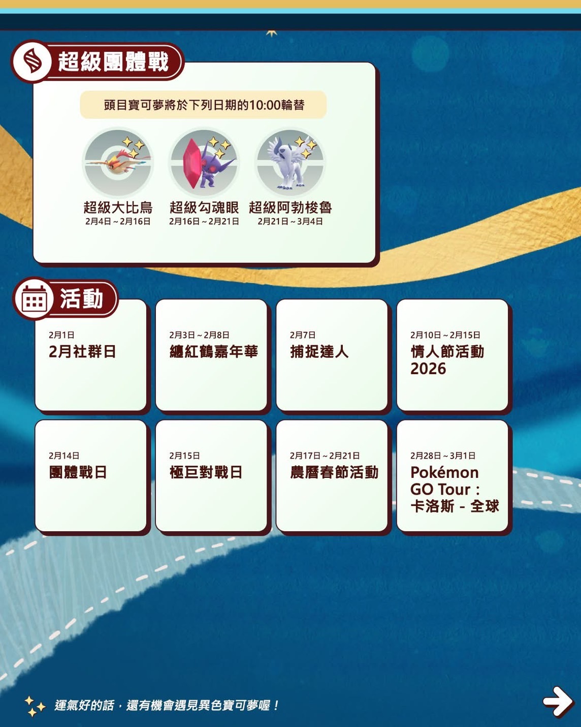 本篇將分享2026年2月最新活動內容,藉此幫玩家們彙整所有資訊,不論是官方還是國外搶先挖掘的資料,以及對戰相關影片內容,讓玩家們能最快速的來了解本次活動有哪些!就讓丹尼帶玩家來看看這月Pokemon GO遊戲有哪些新訊息吧!