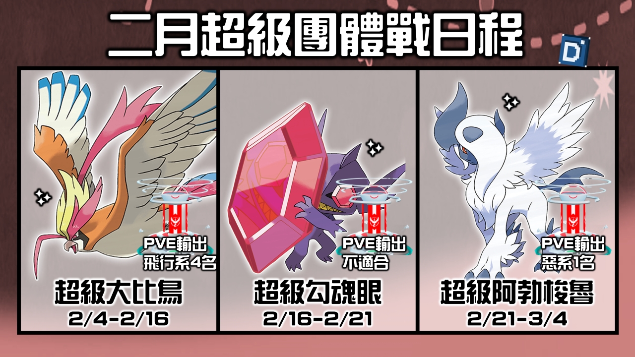 超級進化團體戰為四星頭目,將於活動期間進行更換,以下提供參考各頭目的資訊。
