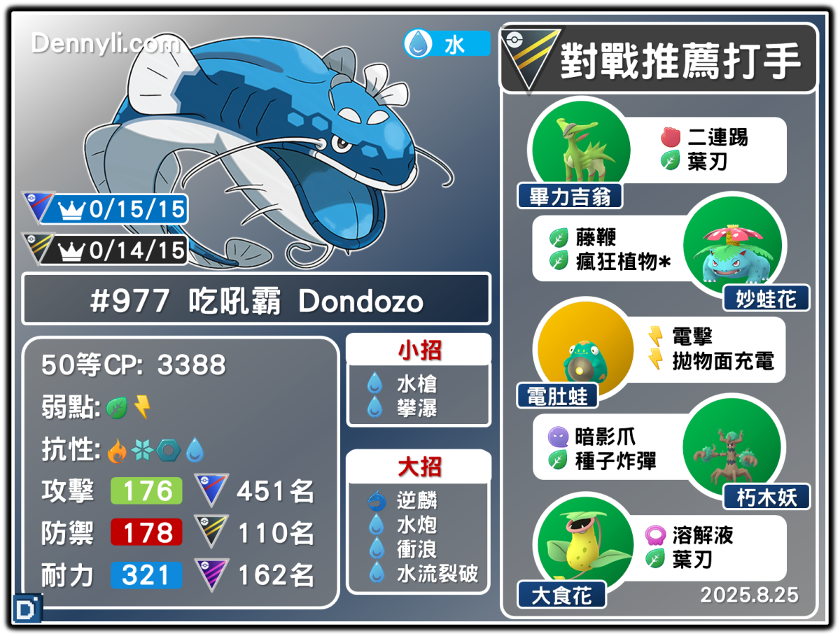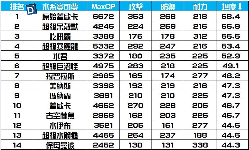 吃吼霸的50等CP達到3388,三圍數值屬於坦度優秀而攻擊力普普,論它最大的用途是拿來守塔,畢竟從下圖表來看,排除不能上道館的原始蓋歐卡跟超級呆殼獸,它確實能稱為水系守塔王!然而PVP的話,初登場的配招太過專注於水系輸出,遇到弱點僅靠逆麟來反擊也不夠強,沒意外國外到時排名肯定很差。