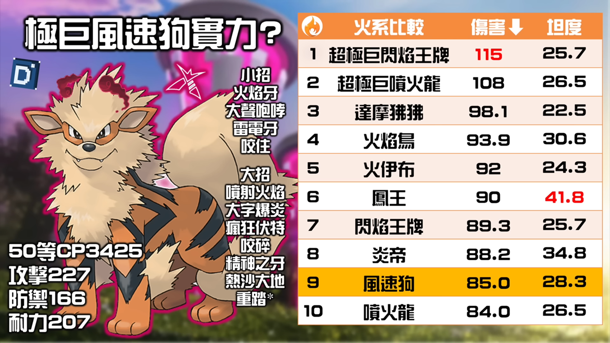 初代「風速狗」是火系的寶可夢,帥氣造型與強悍的體格,是卡通裡君莎小姐的常用寶可夢,在Pokemon GO遊戲裡,風速狗擁有高蓄能的小招大聲咆哮,再仰賴瘋狂伏特的高傷害,出招的壓迫力非常強,在第十二季時更獲得了短能量的精神之牙,大大提升牠在對戰的實力,詳細數據讓丹尼帶玩家來探討!