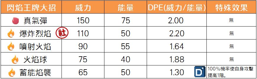 閃焰王牌從登場到社群日後,招式都一直很尷尬!加上坦度的不足在遊戲裡很難生存,雖然有外型與卡通的加持,但論實用性!很明顯不如當今主流的火系角色,最低標準至少要給它一個不同屬性打點的短能量的招式,才能有發揮空間,但至少他在極巨系統裡,能當火系霸主好一陣子!