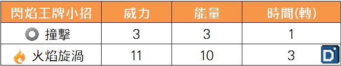 閃焰王牌的50等CP達到3412,三圍數值呈現是攻擊力高而坦度偏弱,主要用途會以火焰漩渦的傷害輸出,但礙於大招屬性打點不夠廣,雖然有社群日後的火焰球與爆炸烈焰加持,但要在對戰使用還是會受到很多限制!從國外排名也能看出,雖然外型帥氣卻是一隻用途蠻尷尬的角色。