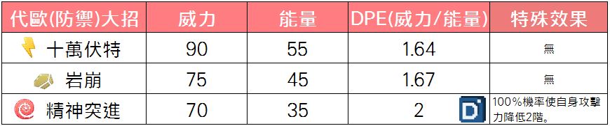 從招式的屬性上可以看出代歐很強大,雖然大多數都能壓制到,但是遇到幾個狀況比較麻煩,就是格鬥系小招打不出傷害時,以及遇到地面系能抗衡電及岩石,會逼迫你發出精神突進導致攻擊力下降的風險,這幾個都是代歐在對戰時比較容易遇到個問題。