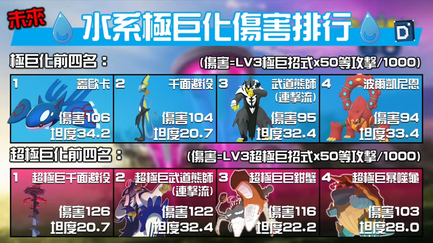 千面避役靠著本身的高攻擊利,能提供極巨系統裡優異的水系傷害量,沒有超極巨化僅會輸給未來出現的蓋歐卡,而超極巨化後則是無人能撼動的水系霸主!加上論超極巨化所有角色,它也是最高傷害量的存在。