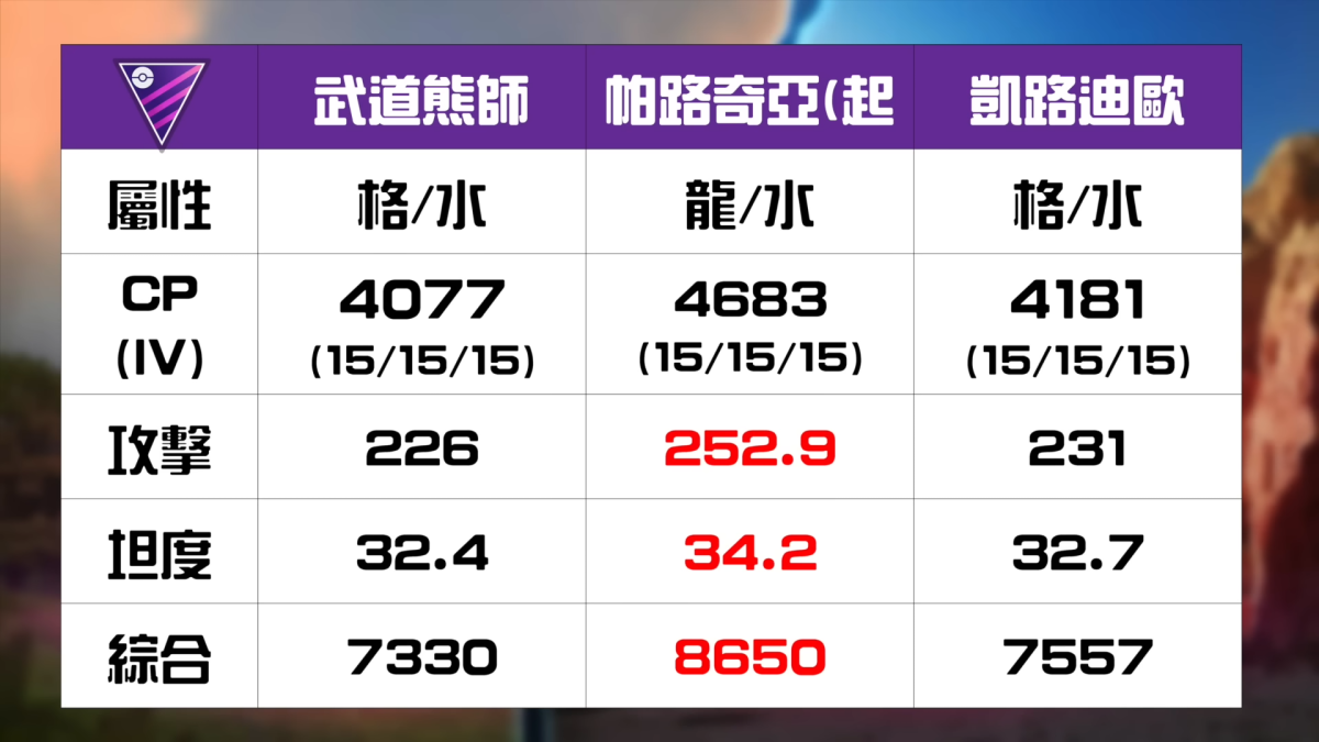 比起PVP來說,神秘之劍最大用途會是在PVE,從格鬥系的輸出傷害來看,凱路迪歐(覺悟)僅輸給超級路卡利歐,在沒系統加持下是當今最強格鬥,對於每天準時拆蛋打塔的玩家算是很好用的角色。至於它目前沒有水系小招就先不看水系輸出了。