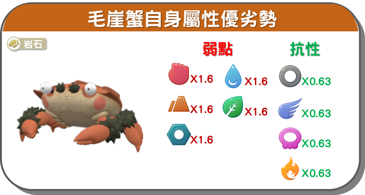 毛崖蟹本身是純岩石系,弱點的五個裡僅有鋼系能用地面招反擊,其餘對應基本很難扭轉,畢竟大招發動速度也沒倒很快,黑洞程度也還算是蠻高,是希望有風向加持才會比較強。