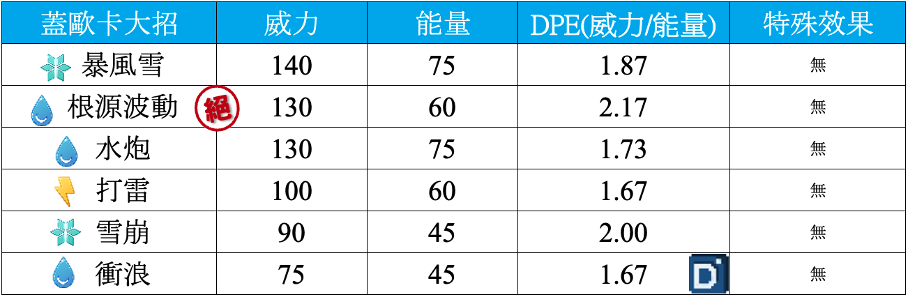 大招部分,短能量的雪崩給予蓋歐卡出招的空間,也能反擊比較難處理的龍系,會是大招的首要選擇,至於第二招則沒有標準配置,打雷或根源波動都有不一樣的打點。