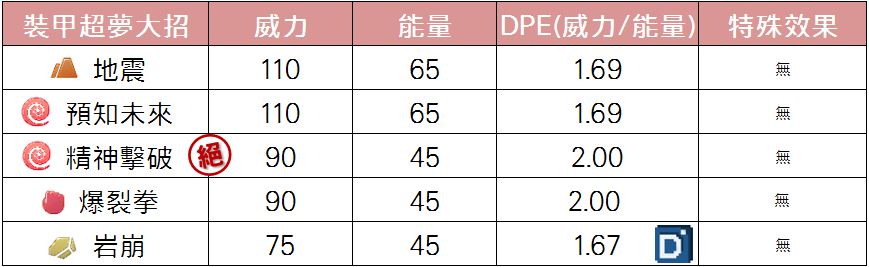 裝甲超夢比較可惜的點,就是小招沒有極高蓄能的招式,不然看它的招式組合,要被完全壓制真的困難!多數情況還是會著重在超能力系的輸出,其次爆裂拳也是必需帶的。