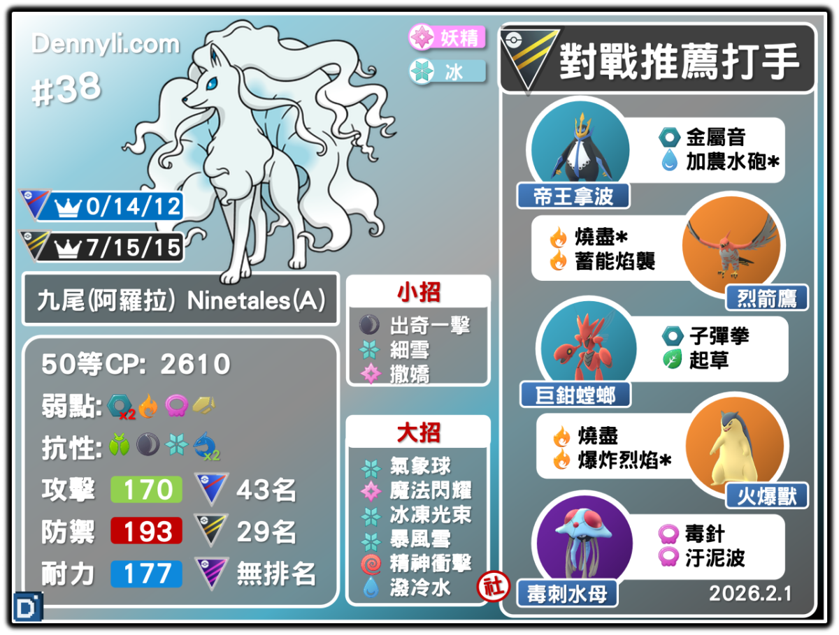 第七代「阿羅拉九尾」是冰與妖精系寶可夢,擁有著體質、屬性及招式的優勢下,是目前Pokemon GO對戰的主流角色,然而再2026年二月還獲得社群日的加持,實力將會提升到怎樣?就讓丹尼帶玩家們深入探討。