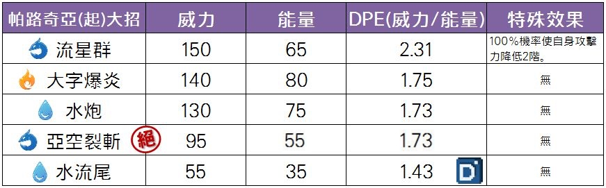 帕路奇亞(起源)擁有三個屬性的招式,火系這邊就先不考慮,畢竟大字爆炎的實用性太低,再來龍系與水系招式組合下,多數情況會以水流尾拚速攻,剛好弭補大師聯盟欠缺好用水系招式的一點,至於不帶流星群後更能在對應龍系更穩定。