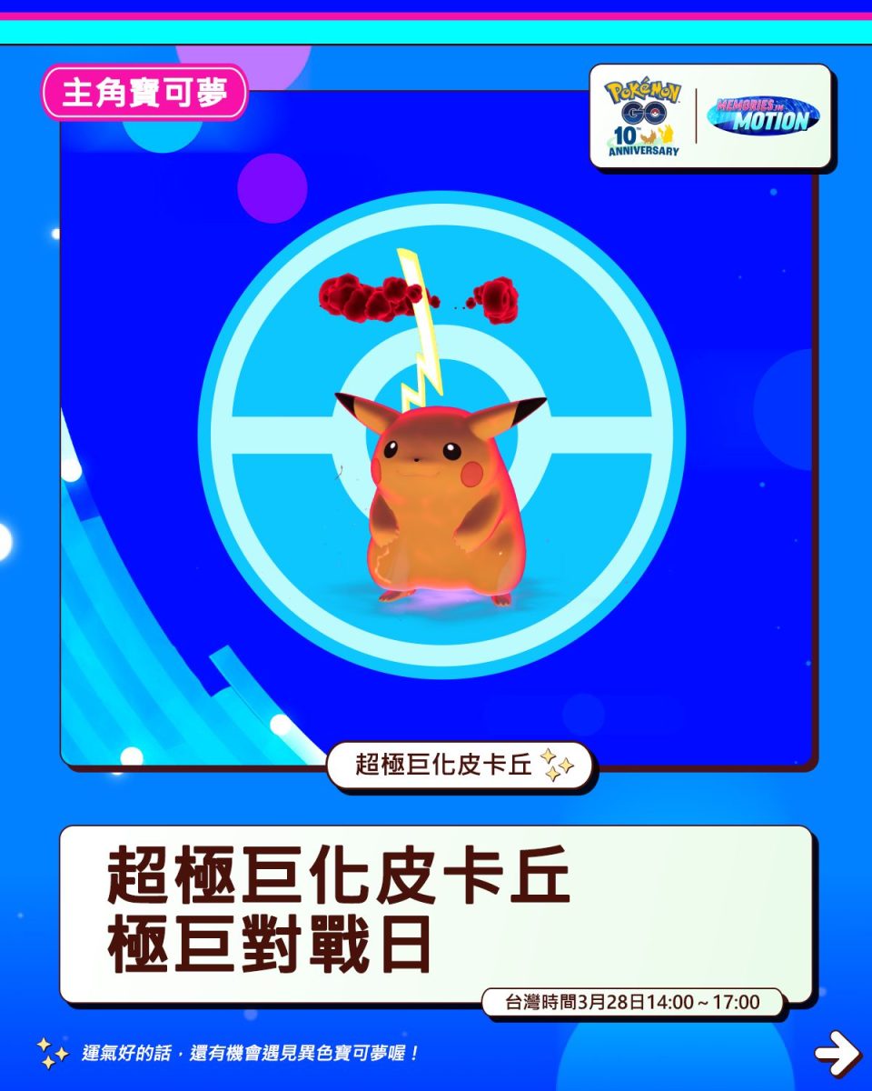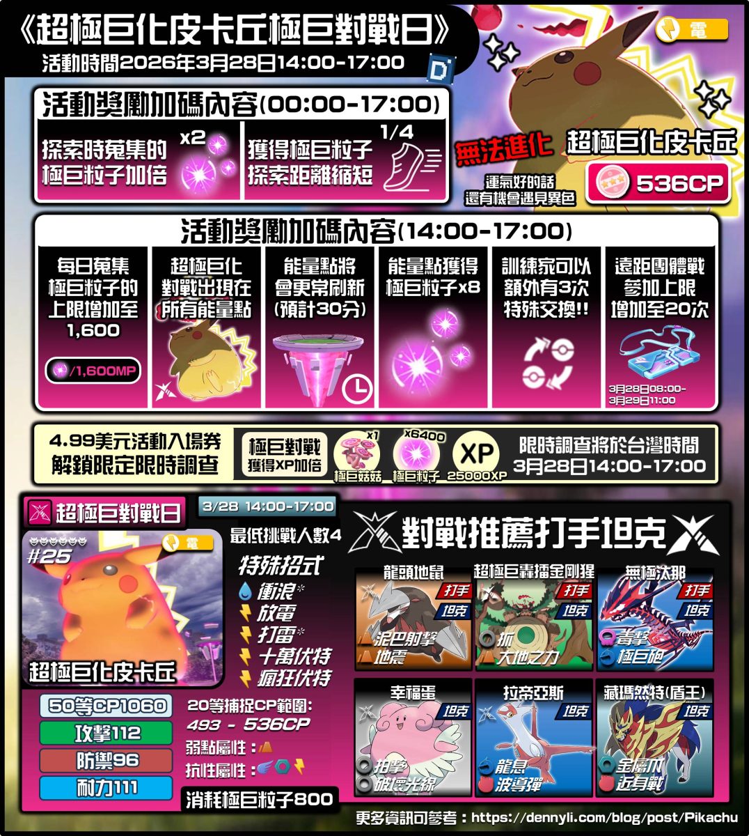 皮卡丘的極巨化於GO遊戲裡2026/3/9登場,進化後的雷丘論傷害值與坦度,都比起目前的電系來得弱,初登場明顯就是吉祥物的角色。