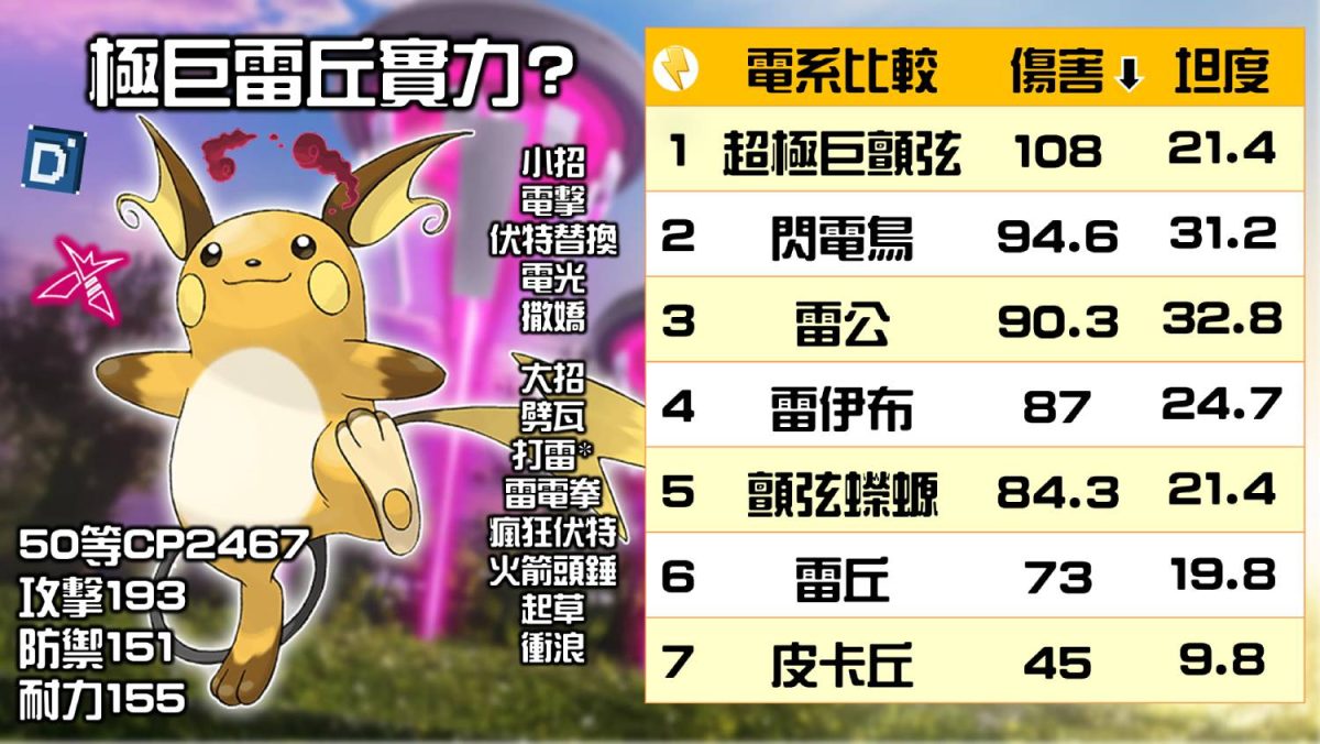 初代「雷丘」是電系的寶可夢,憑藉進化前的皮卡丘的主角光環,想必玩家也對雷丘不陌生,然而在Pokemon GO遊戲裡,玩家比較常使用阿羅拉雷丘,普通的雷丘出場機率卻不高,實力真的不夠強在對戰使用嗎?就讓丹尼帶玩家們深入了解看看。