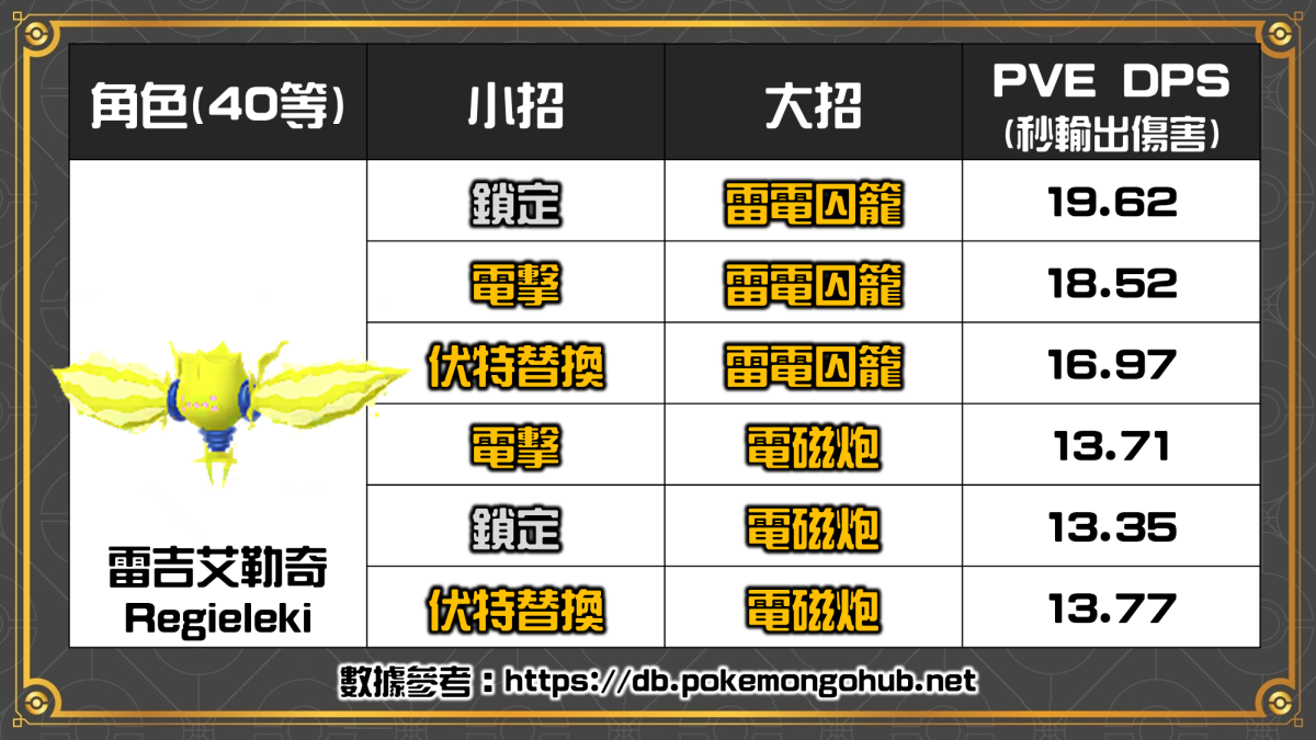 精靈寶可夢雷吉艾勒奇等級對應CP表