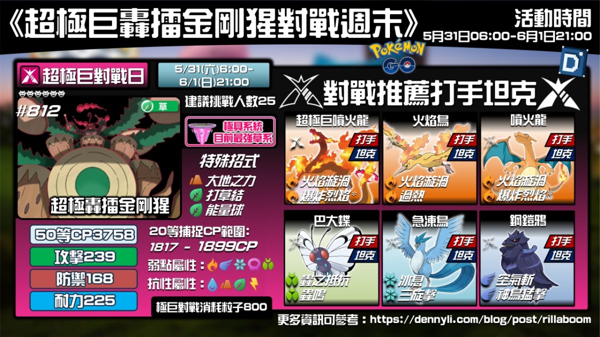 轟擂金剛猩在目前的極巨系統裡,超極巨化是草系第一名,普通極巨化則會輸給超極巨妙蛙花。